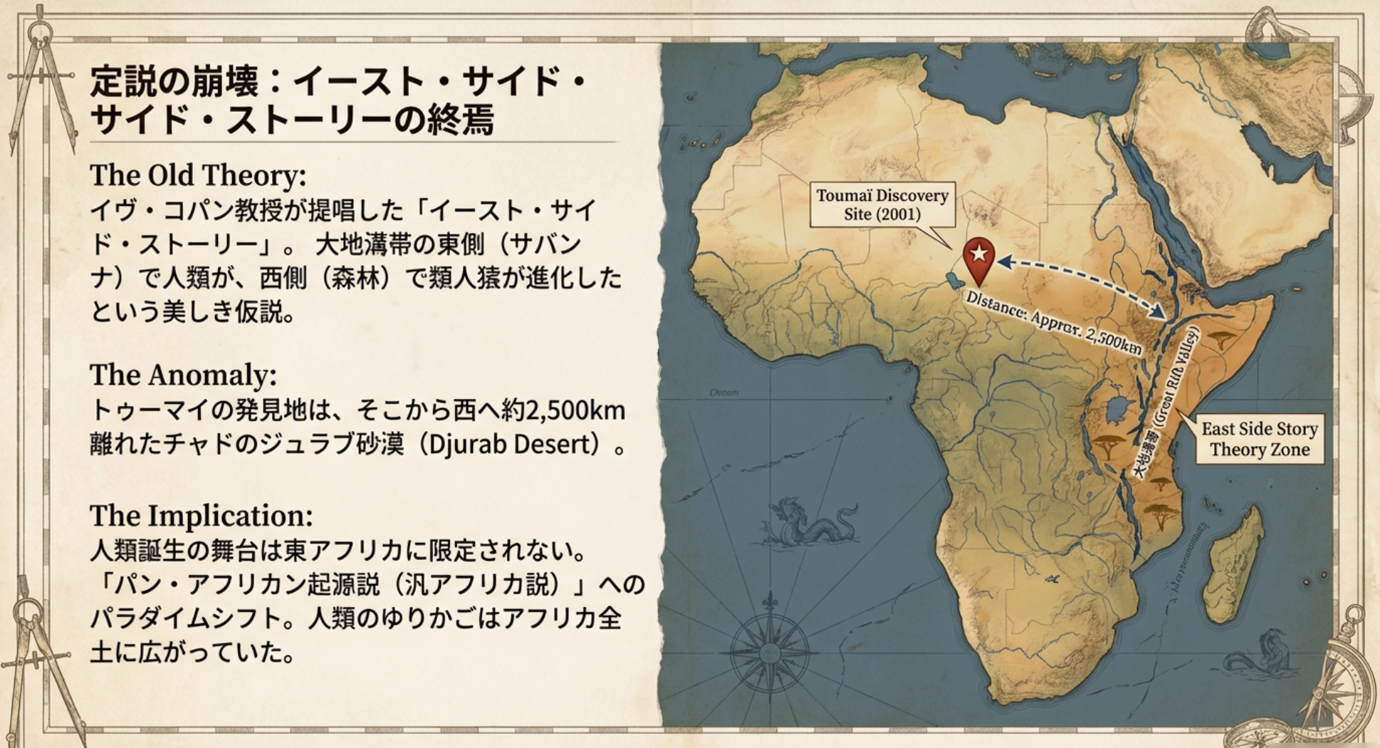 「人類は東アフリカで誕生した」という「イースト・サイド・ストーリー」が定説となっていた時代に、遥か西に離れた中央アフリカのチャドで発見されたこの化石は、人類進化の舞台が東アフリカだけに限定されないことを世界に知らしめました。