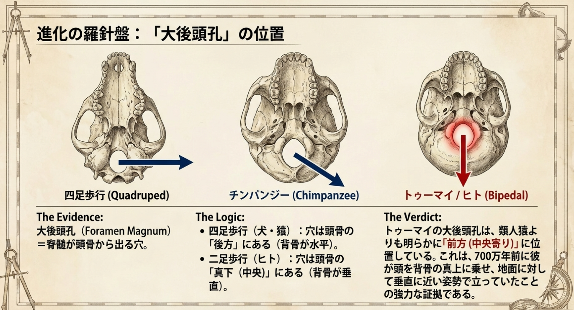 しかし、小さな脳(360cc)と、直立歩行に適した大後頭孔を持つトゥーマイの存在は、「まず立った。そして、その後に脳が大きくなった」という順序を決定づけたのです。