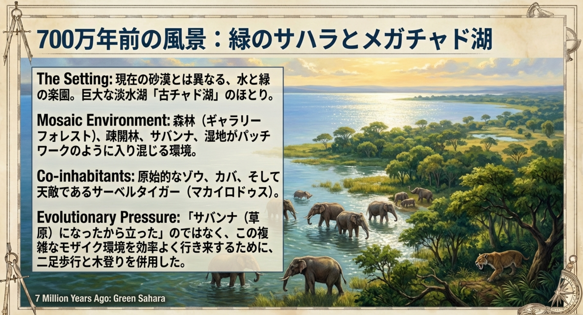 この複雑なモザイク環境こそが、サヘラントロプスのような「二足歩行もできるし、木登りも得意」というハイブリッドな身体能力を進化させた原動力だったのかもしれません。