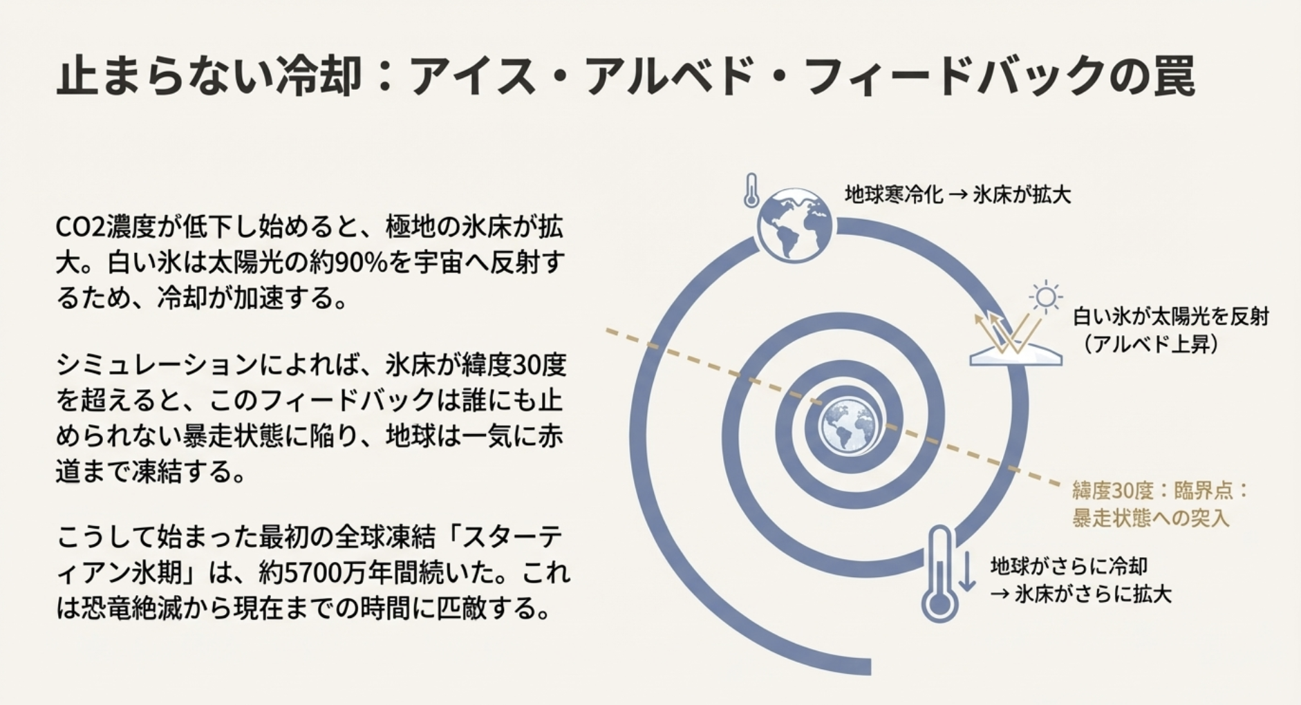 太陽光のほとんどを氷が反射してしまうため、地球は宇宙空間に熱を逃がし続け、逃げ場のない寒冷化のスパイラルに陥っていました。